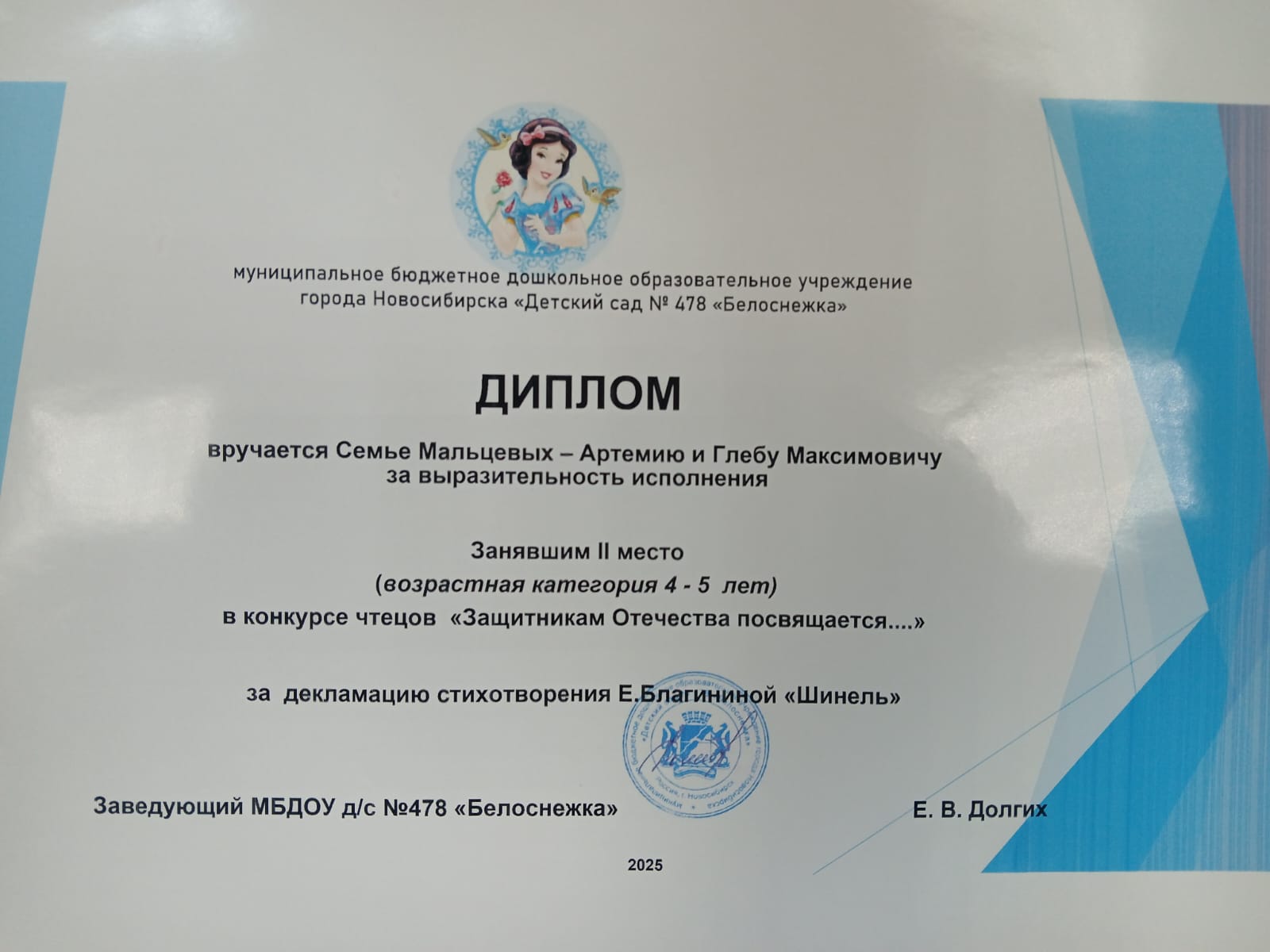 Диплом Семье Мальцевых-Артемию и Глебу Максимовичу в конкурсе чтецов "Защитникам Отечества посвящается..." за декламацию стихотворения Е. Благининой "Шинель"