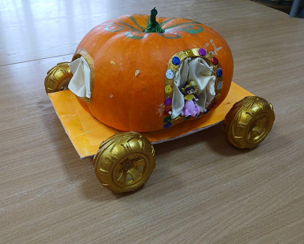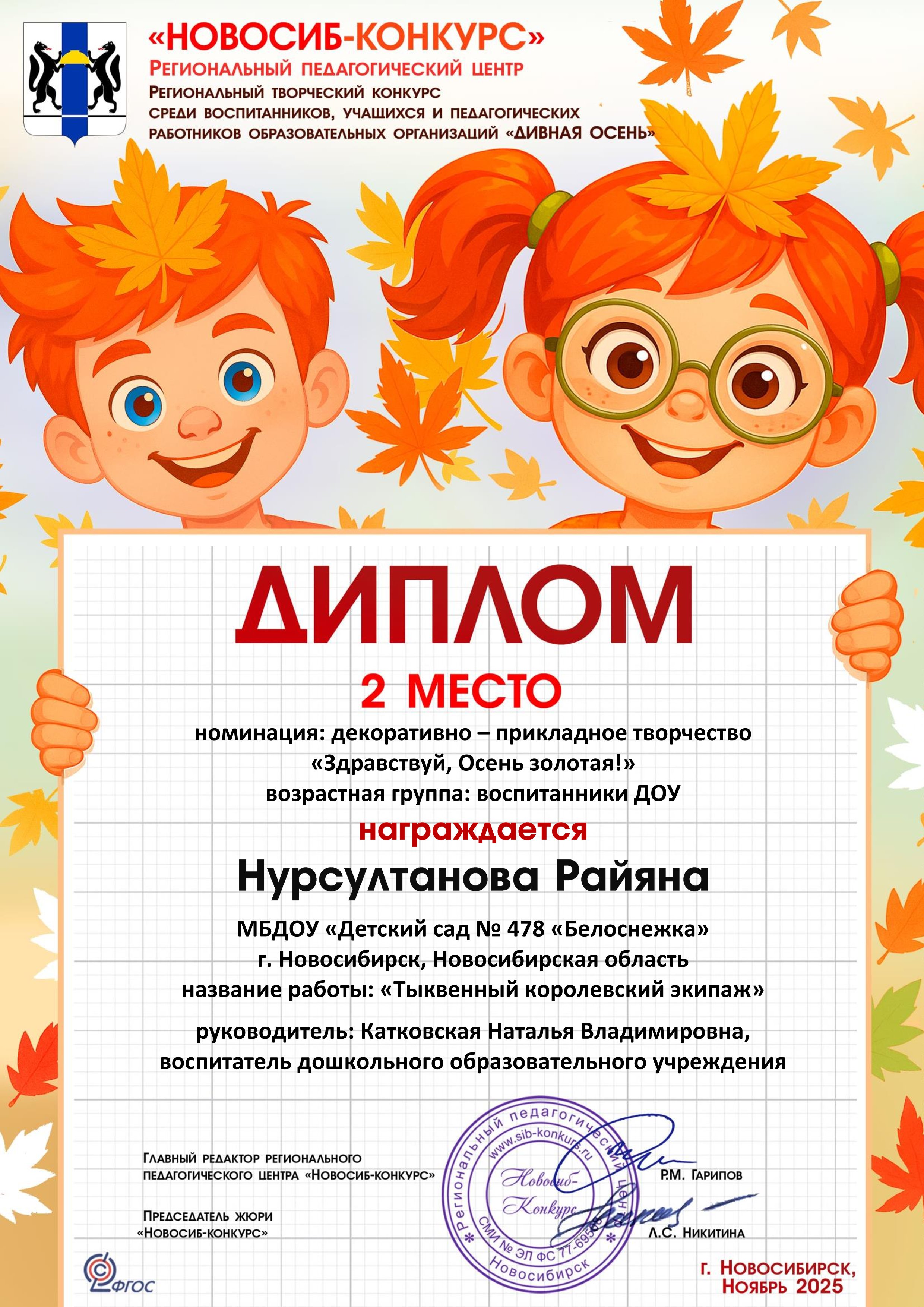 Награждается Нурсултанова Райяна диплом 2 место Региональный педагогический конкурс "НОВОСИБ_КОНКУРС" номинация: декоративно-прикладное творчество "Здравствуй, Осень золотая!" название работы:"Тыквенный королевский экипаж"
