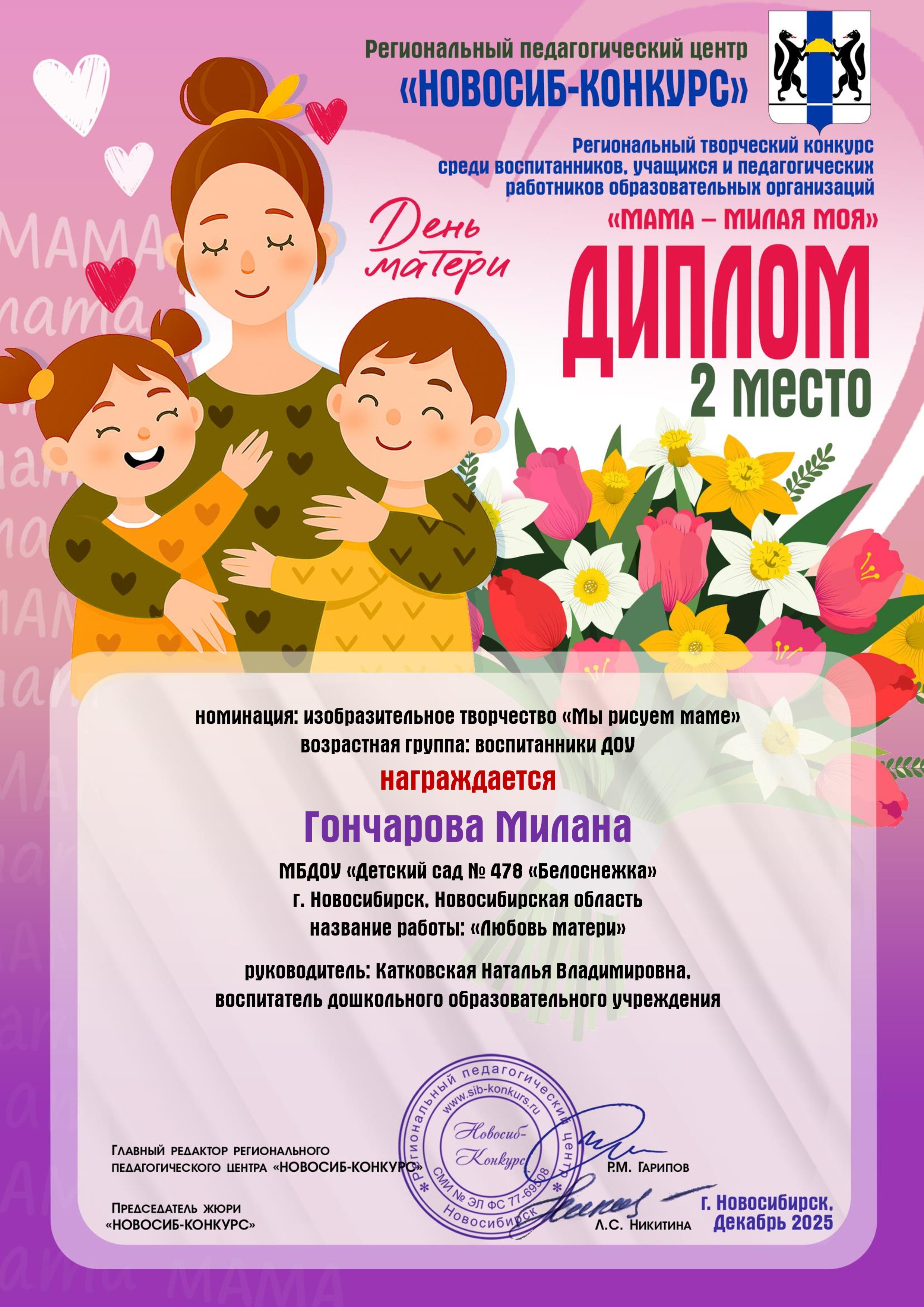 Региональный педагогический центр "Новосиб-конкурс" Диплом 2 место награждается Гончарова Милана номинация:изобразительное творчество "Мы рисуем мама" название работы: "Любовь матери"